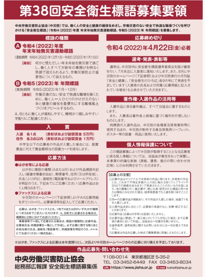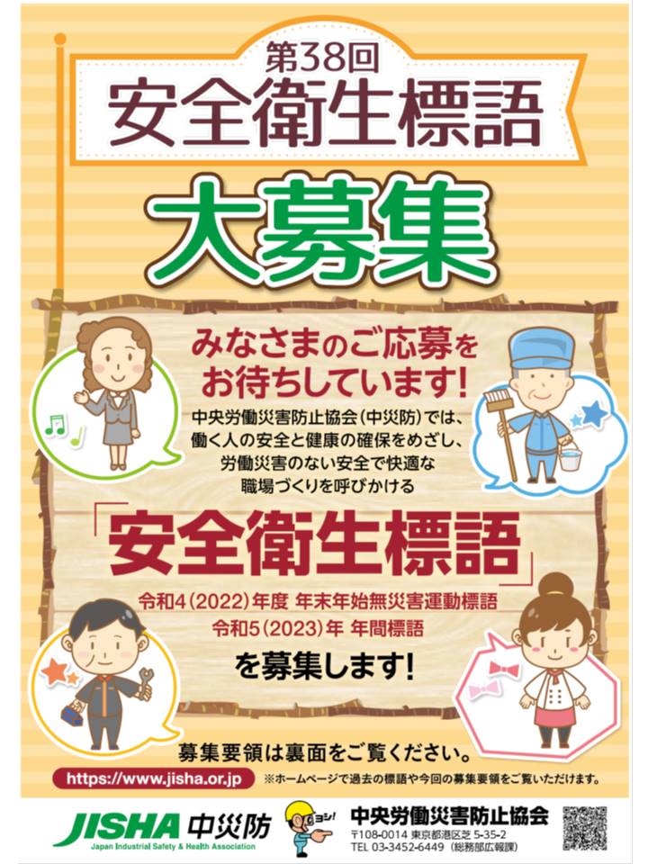 中央労働災害防止協会(中災防)は、第38回安全衛生標語の募集を行っています。令和4(2022)年度年末年始無災害運動の標語と令和5年(2023)年 年間標語の2種類です。詳しくは中災防ホームページをご覧下さい。