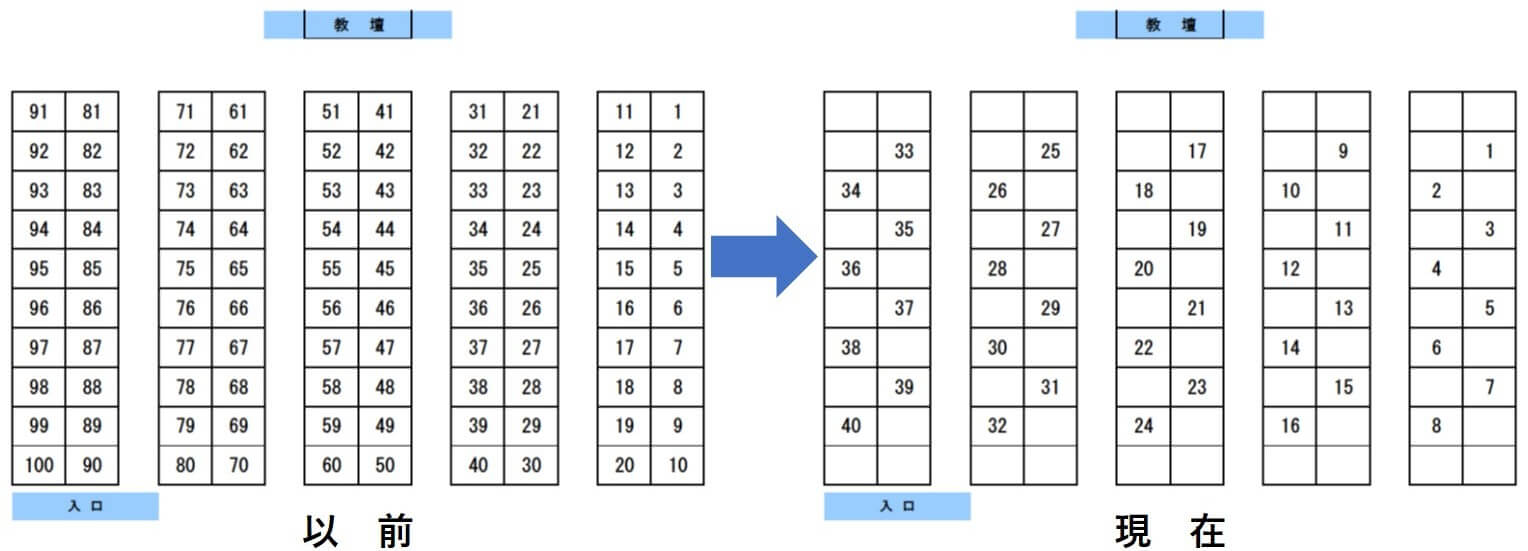 受講定員を通常の半分以下とし、席間を空けジグザグ配置を行うことにより受講生間のソーシャルディスタンスを確保しています。