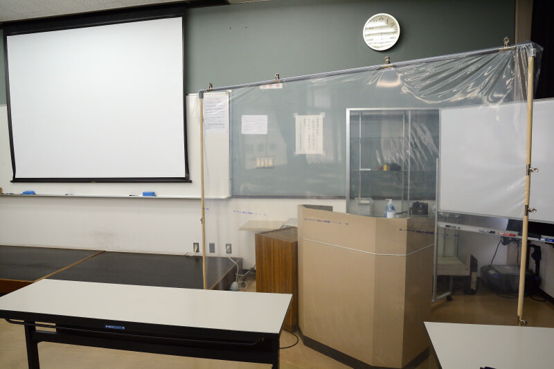 受付窓口や講師演台周辺に飛沫防止シールドを設置しています。シールドの設置が困難な場合は、フェイスシールドを着用して対応させていただきます。