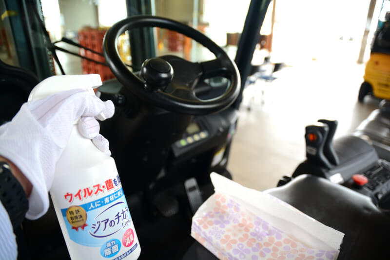 実技講習に使用する機材(フォークリフト等)は使用者が交替するごとに消毒を行っています。